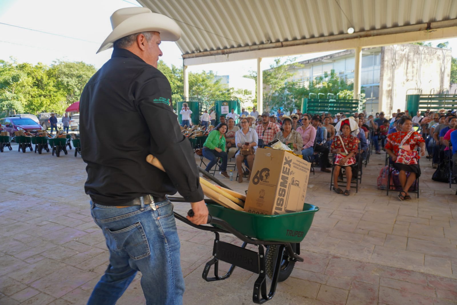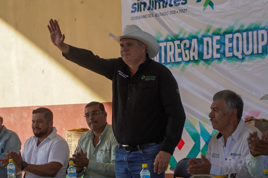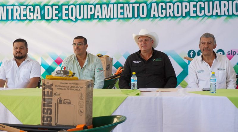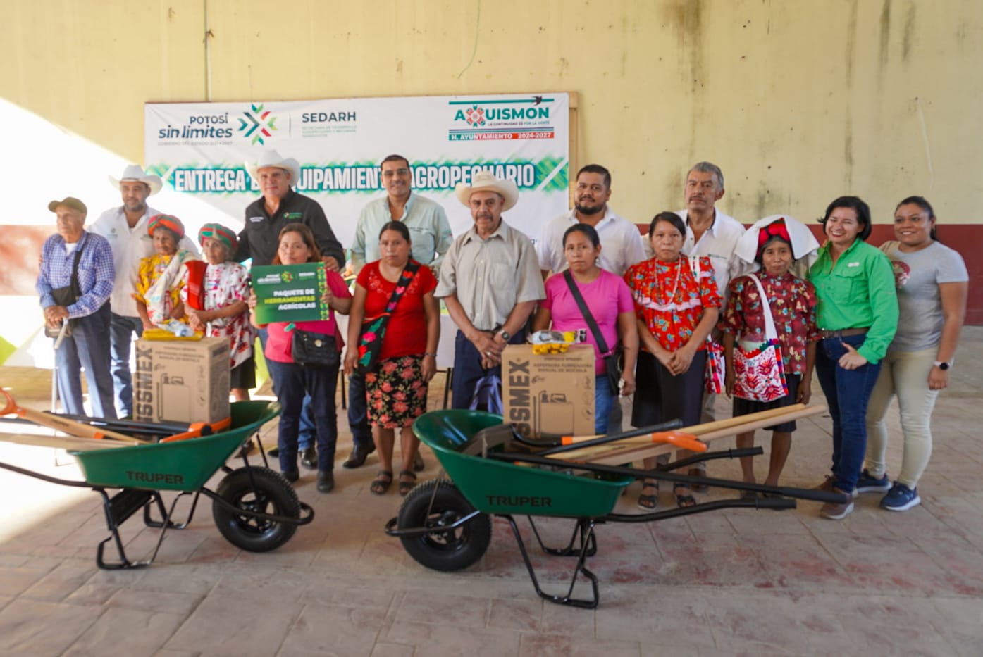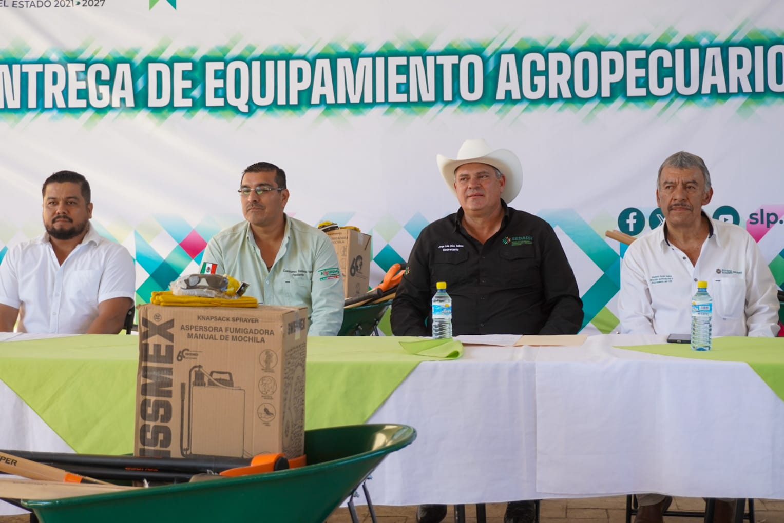 La entrega se realizó en de Aquismón y fue encabezada por el titular de la dependencia, Jorge Luis Díaz Salinas, en representación del Mandatario Estatal, con la presencia de autoridades municipales y líderes productores. En el evento se distribuyeron 292 paquetes de herramientas —que incluyeron carretillas, picos, palas, gafas de seguridad y bombas aspersoras—, así como seis remolques ganaderos, beneficiando a 298 unidades de producción familiar.