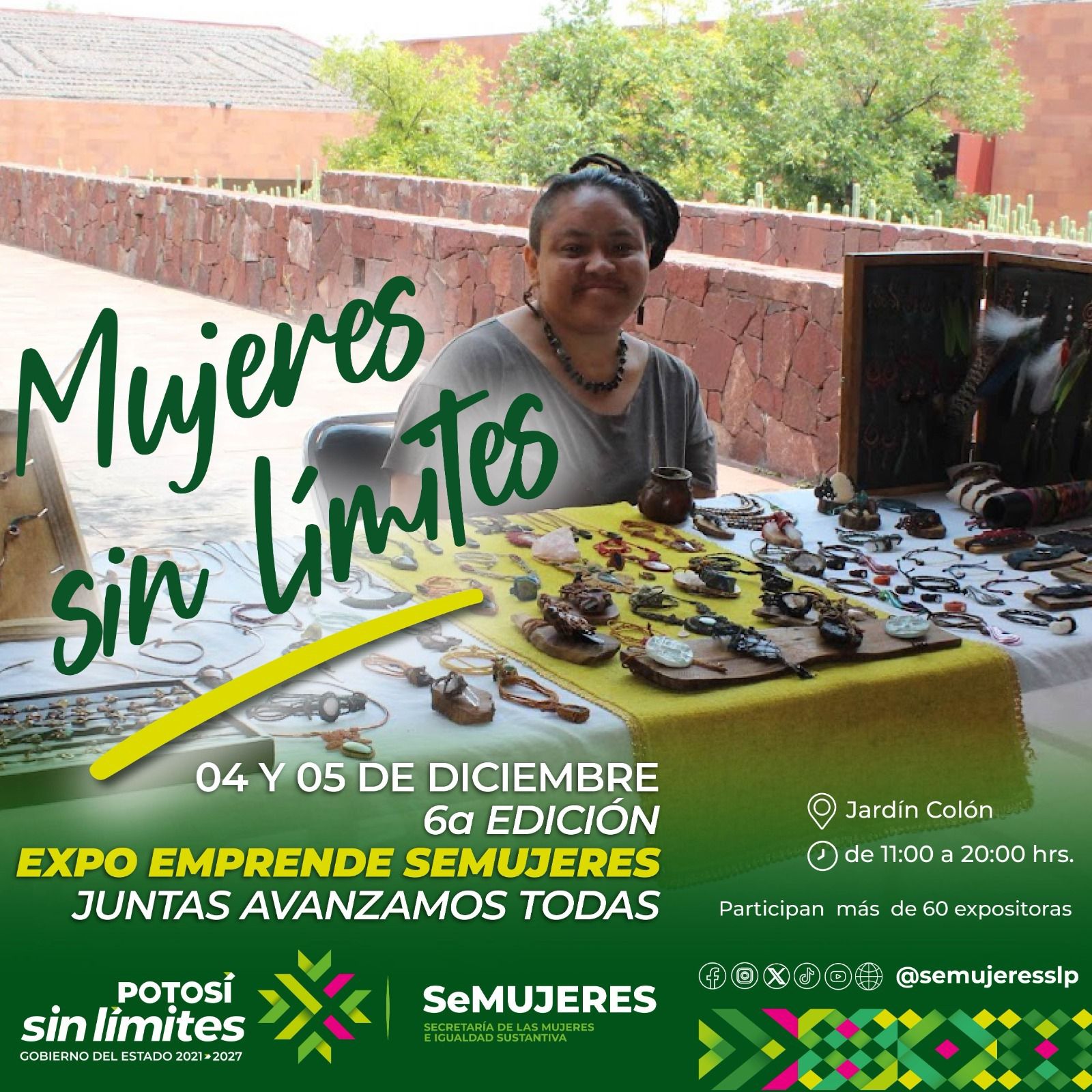 Con el objetivo de apoyar sin límites a más de 60 emprendedoras y microempresarias, como lo ha instruido el Gobernador del estado Ricardo Gallardo Cardona, la Semujeres crea espacios gratuitos para que las potosinas puedan ofrecer sus productos y servicios di a conocer la encargada de despacho de la dependencia, Gloria Serrato Sánchez.