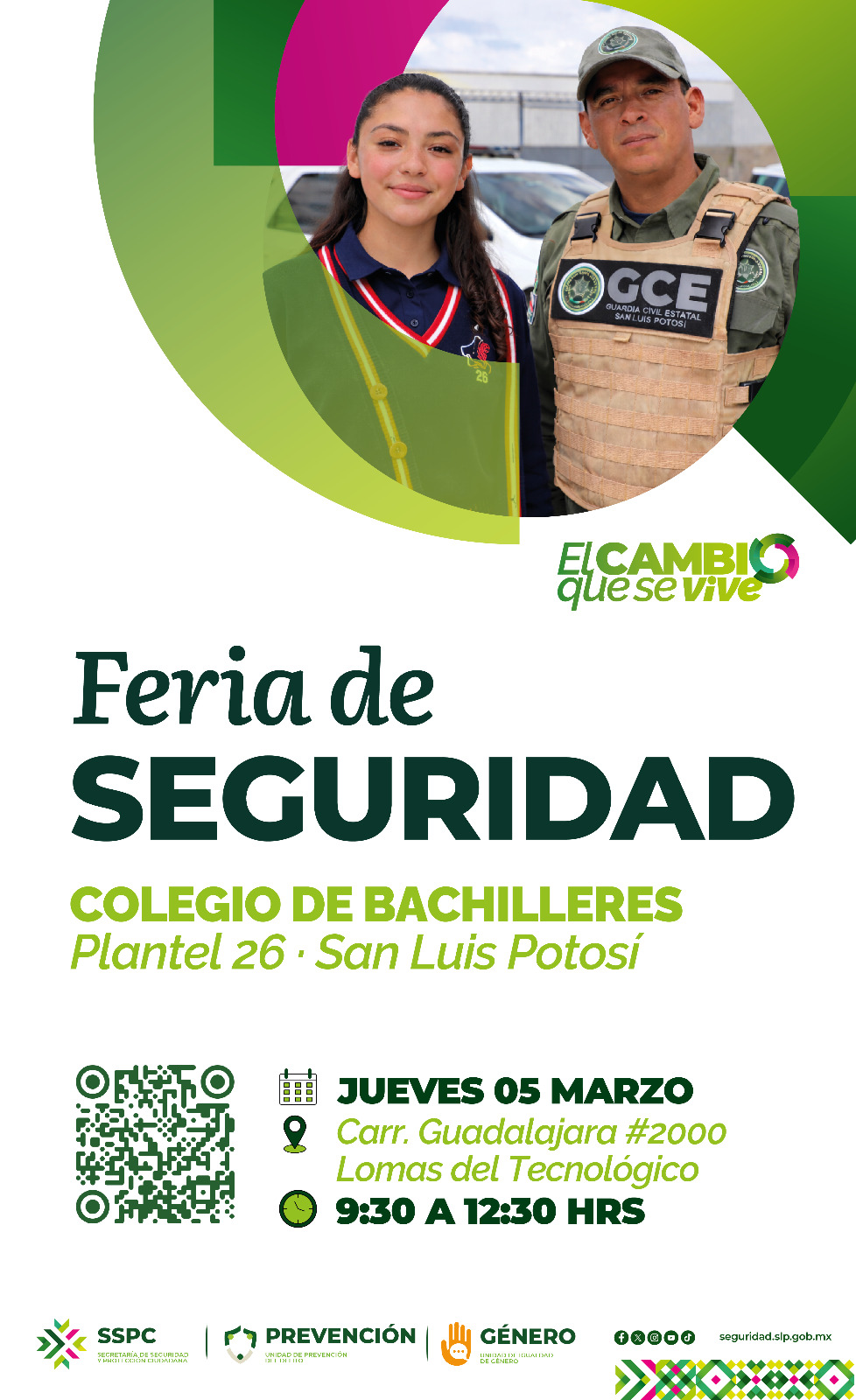 En seguimiento a la agenda de proximidad social, este 5 de marzo se llevará a cabo una nueva Feria de Seguridad en el Colegio de Bachilleres (Cobach) 26 de la capital, donde se brindará asesoramiento en prevención de la violencia contra las mujeres y atención especializada para prevenir delitos cibernéticos y el 12 de marzo en Mexquitic de Carmona.