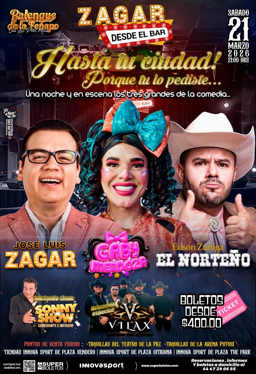 Siguiendo la instrucción del Gobernador del Estado, Ricardo Gallardo Cardona, de fortalecer la oferta de entretenimiento para las familias potosinas, el Patronato de la Feria Nacional Potosina (Fenapo) presentará el sábado 21 de marzo a las 21:00 horas una gran velada de comedia en el Palenque, encabezada por José Luis Zagar con su espectáculo “Desde el Bar… Hasta tu ciudad, porque tú lo pediste”, acompañado por Gaby Mendoza y Edson Zúñiga “El Norteño”, quienes prometen una noche llena de humor y cercanía con el público.