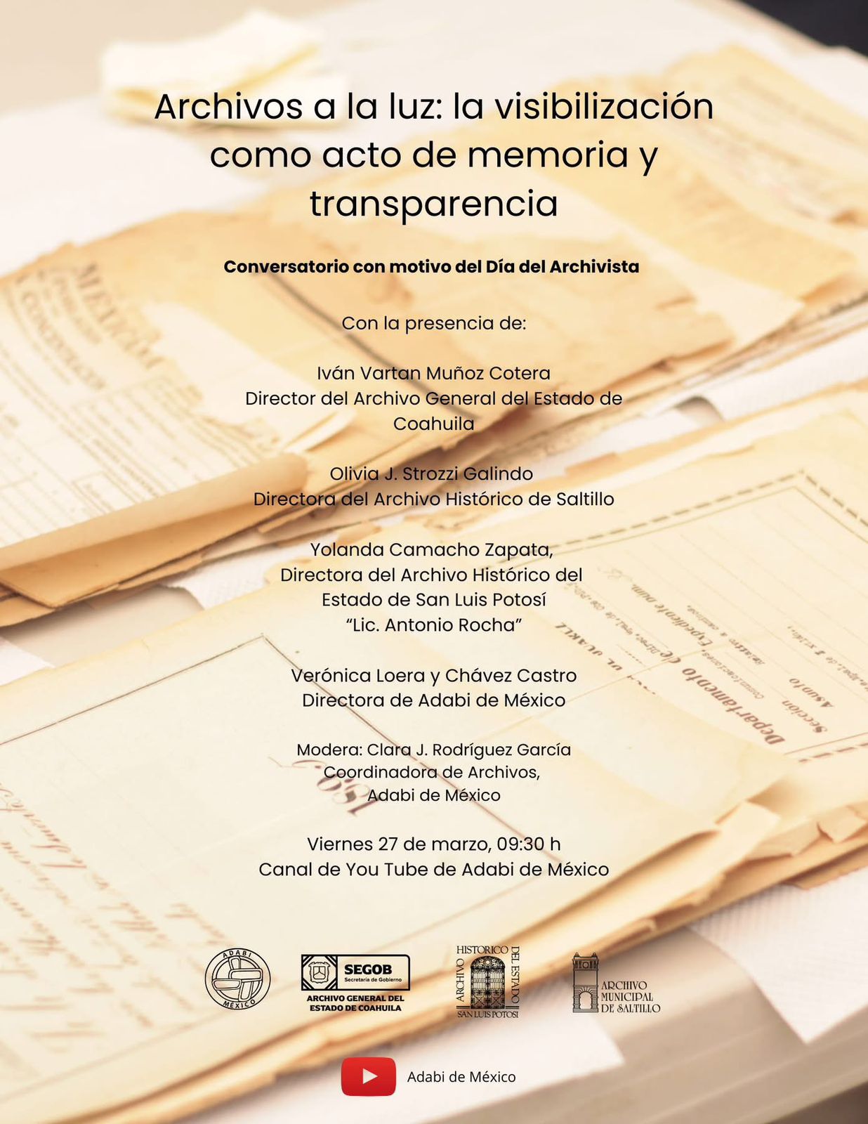 Bajo la encomienda del Gobernador Ricardo Gallardo Cardona, el Archivo Histórico del Estado (AHESLP) participó en el conversatorio nacional “Archivos a la luz: la visibilización como acto de memoria y transparencia”, organizado por la asociación Apoyo al Desarrollo de Archivos y Bibliotecas de México (ADABI).
