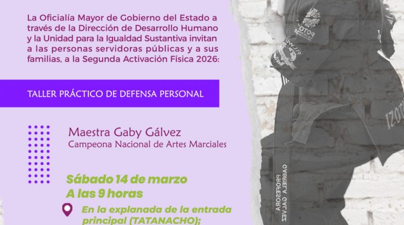 Como parte de las acciones que impulsa el Gobernador del Estado Ricardo Gallardo Cardona para promover el bienestar sin límites de las mujeres potosinas, la Oficialía Mayor (OM), a través de la Unidad de Igualdad Sustantiva, llevará a cabo la Segunda Activación Física 2026: Taller Práctico de Defensa Personal.
