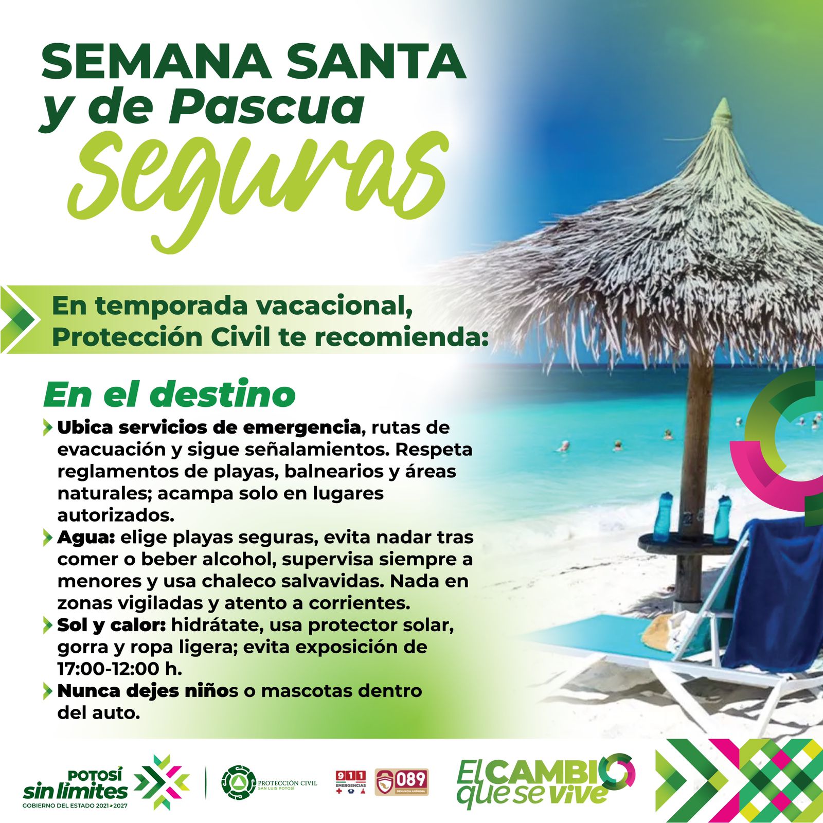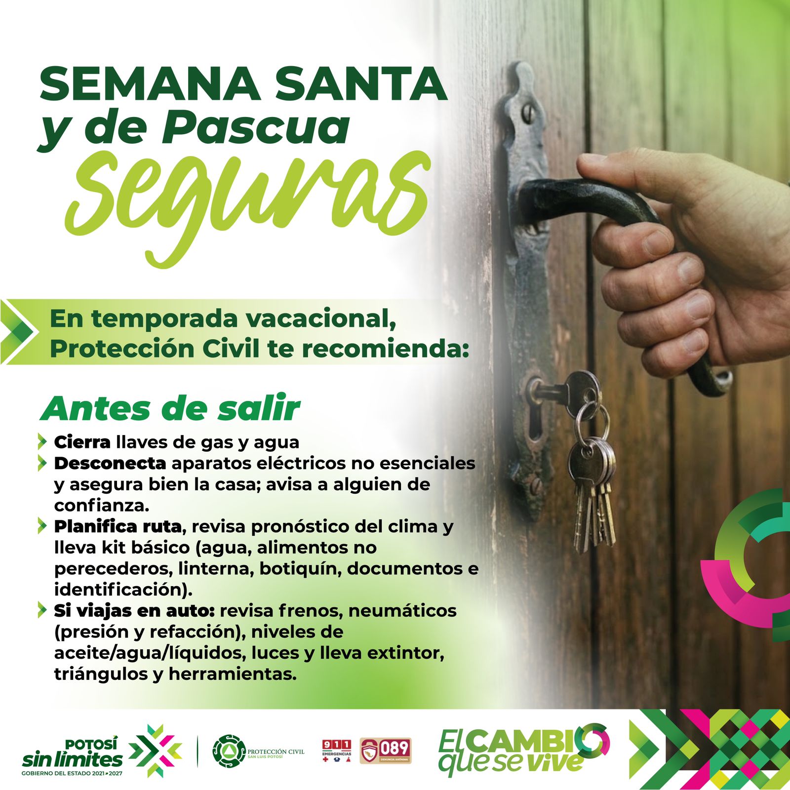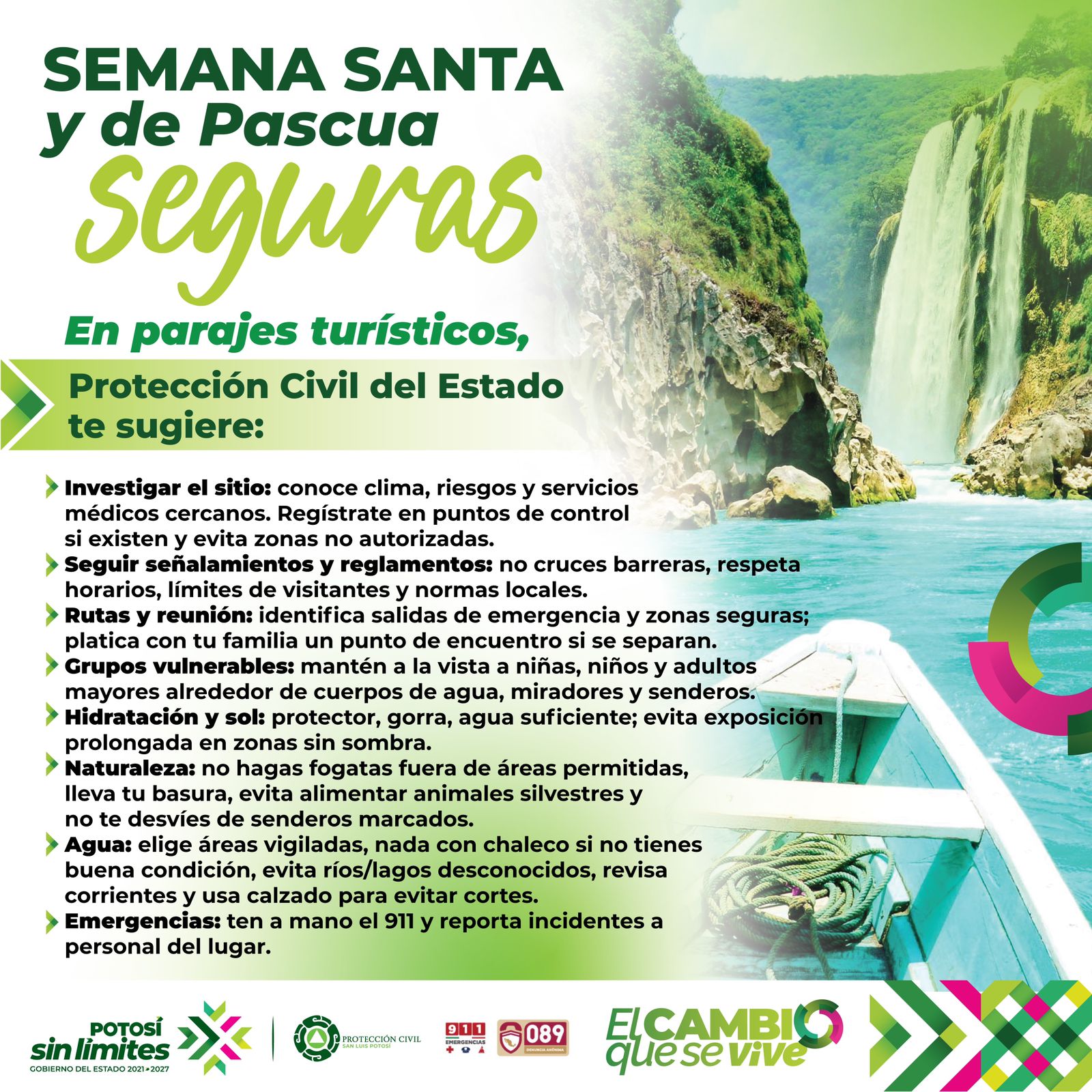 Siguiendo la instrucción del Gobernador Ricardo Gallardo Cardona de reforzar el cambio que se vive y se siente mediante la protección de las familias, la Coordinación Estatal de Protección Civil (CEPC) desplegó un plan de prevención y vigilancia durante la temporada vacacional de Semana Santa, luego de que este fin de semana se registrará la asistencia de miles de personas en parajes, ríos, balnearios, cuerpos de agua y pueblos mágicos, informó el titular de la dependencia, Mauricio Ordaz Flores.