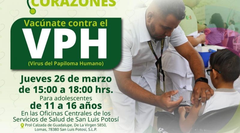 Siguiendo la instrucción del Gobernador Ricardo Gallardo Cardona de fortalecer la salud preventiva, los Servicios de Salud realizarán una jornada de vacunación contra el Virus del Papiloma Humano (VPH) el 26 de marzo, en un horario de 15:00 a 18:00 horas, en las oficinas centrales de la dependencia, con el respaldo del programa Visitando Corazones y un trabajo sin límites en favor de las juventudes.