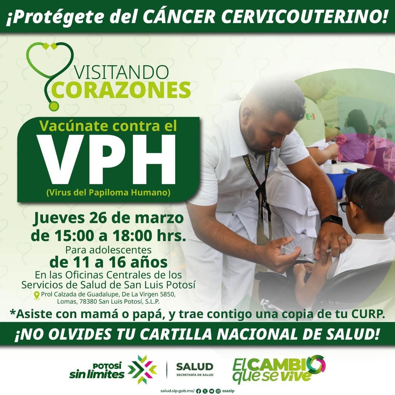 Siguiendo la instrucción del Gobernador Ricardo Gallardo Cardona de fortalecer la salud preventiva, los Servicios de Salud realizarán una jornada de vacunación contra el Virus del Papiloma Humano (VPH) el 26 de marzo, en un horario de 15:00 a 18:00 horas, en las oficinas centrales de la dependencia, con el respaldo del programa Visitando Corazones y un trabajo sin límites en favor de las juventudes.