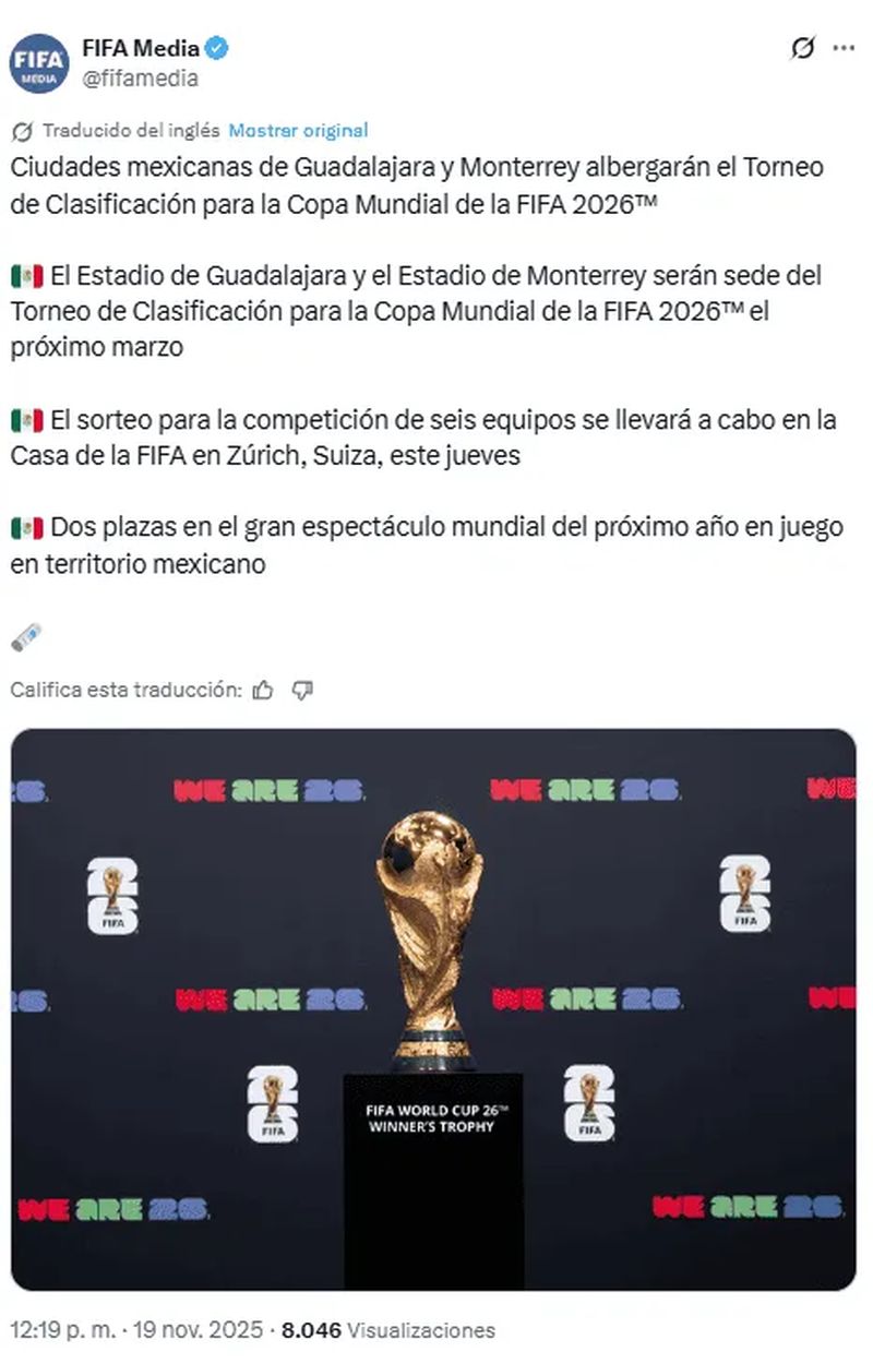 Después de un largo periodo de rumores, este miércoles 19 de noviembre, la FIFA anunció de manera oficial que Guadalajara y Monterrey serán las ciudades anfitrionas del Torneo de Repechaje de la Copa Mundial de 2026.