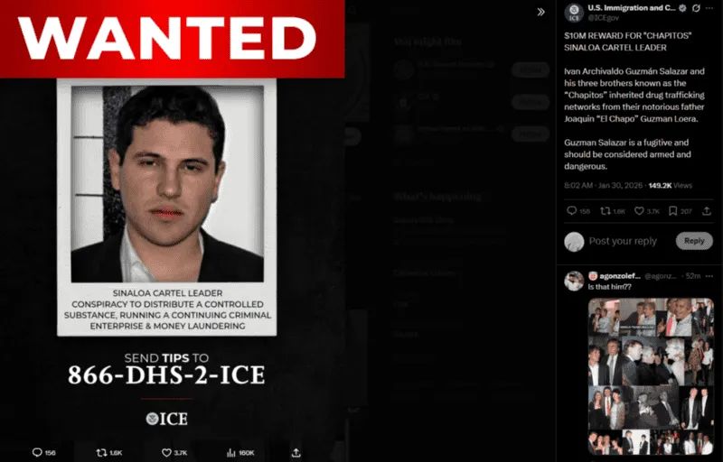 El Servicio de Control de Inmigración y Aduanas (ICE) mantiene la recompensa de 10 millones de dólares para capturar a Iván Archivaldo Guzmán, líder de Los Chapitos.