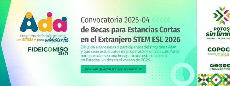 El Consejo Potosino de Ciencia y Tecnología (Copocyt) lanzó la Convocatoria 2025-04 de Becas para estancias cortas en el extranjero “STEM ESL Program for High School Students 2026”, dirigida a estudiantes mujeres de preparatoria participantes o egresadas de ADA, Programa de fortalecimiento en STEM+. Esta iniciativa busca ofrecer experiencias de aprendizaje internacional que amplíen las capacidades académicas y personales de las jóvenes, reflejando la visión del Gobernador Ricardo Gallardo Cardona de impulsar oportunidades educativas sin límites.