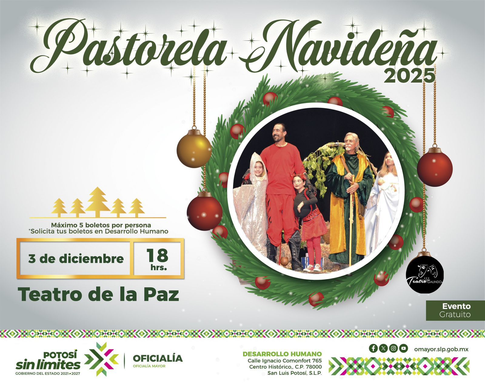 La Oficialía Mayor (OM) invita a servidores públicos y sus familias a disfrutar de manera gratuita la obra “Pastorela Navideña” el próximo 3 de diciembre a las 18:00 horas en el Teatro de la Paz, presentada por la Compañía de Teatro Galindo. Este evento marca el inicio de los festejos decembrinos y fomenta la convivencia y el compañerismo.
