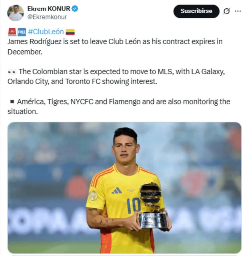 Pero las opciones del colombiano no se quedan solo en México. Según el especialista en transferencias Ekrem Konur, varios clubes de la MLS también están pendientes de su situación. Entre ellos están Toronto FC, Orlando City, New York City FC y LA Galaxy. Además, el Flamengo de Brasil también figura como uno de los equipos interesados.