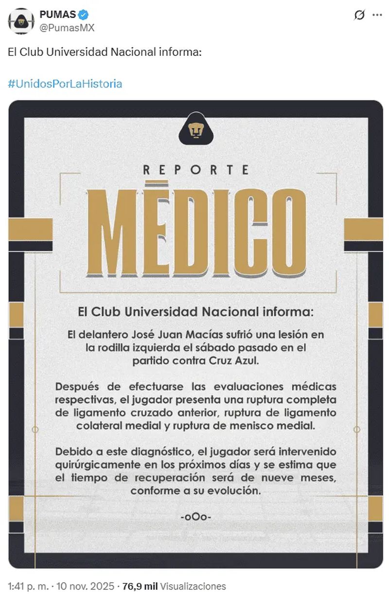 Cuando José Juan Macías estaba teniendo un repunte en su carrera futbolística, marcando goles, brindando asistencias y siendo un jugador determinante con los Pumas, un nuevo revés pondrá a prueba su resiliencia, ya que este lunes se confirmó que el delantero mexicano estará fuera de las canchas por nueve meses debido a una grave lesión.