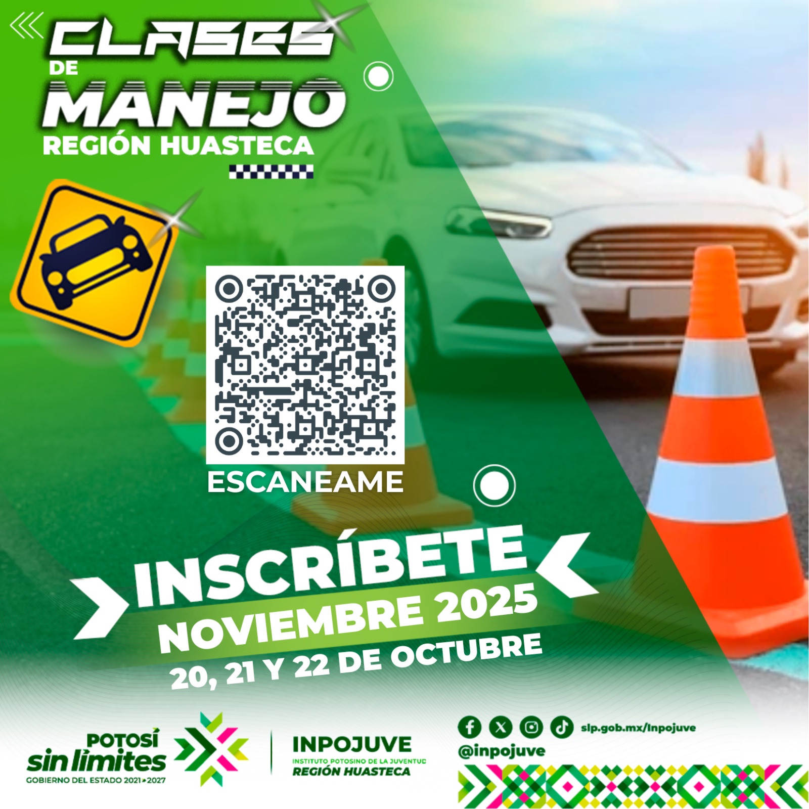 El Gobierno del Estado, encabezado por Ricardo Gallardo Cardona, fomenta la educación vial sin límites, a través del Instituto Potosino de la Juventud (Inpojuve), abriendo inscripciones para las clases de manejo en la Huasteca durante el mes de noviembre. Las inscripciones se realizarán del 20 al 22 de octubre en las oficinas de la dependencia en la región, ubicadas en calle Morelos 104 interior L9, zona centro de Ciudad Valles.