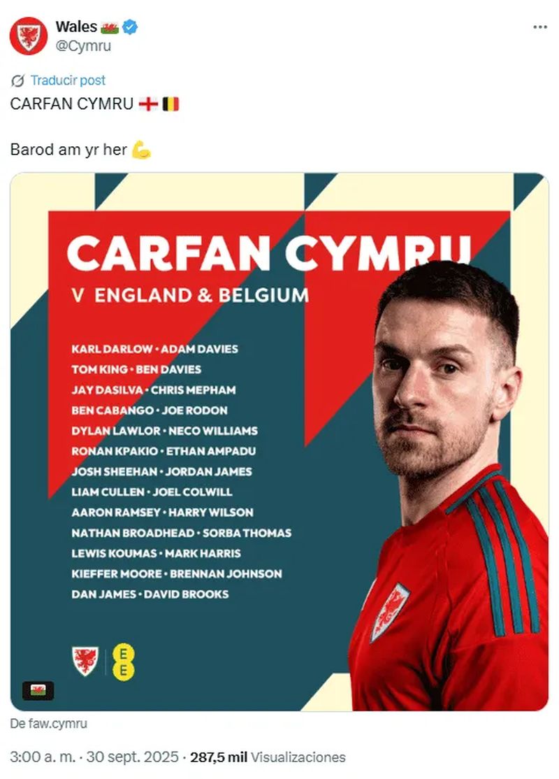 Gales jugará ante Inglaterra en Wembley Stadium el jueves 9 de octubre en un amistoso, y recibirá a Bélgica el lunes 13 en el Cardiff City Stadium, en un duelo de clasificación para el Mundial 2026.