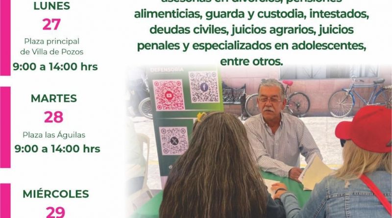 La Secretaría General de Gobierno (SGG), a través de la Defensoría Pública del Estado y en coordinación con el ayuntamiento de Villa de Pozos, desplegará asesoría jurídica y acompañamiento legal gratuitos mediante la jornada “Tu Defensoría” para que la población pueda resolver dudas y acceder a orientación profesional sin costo.