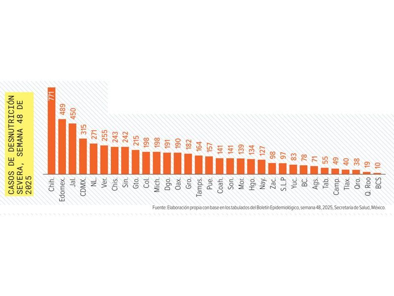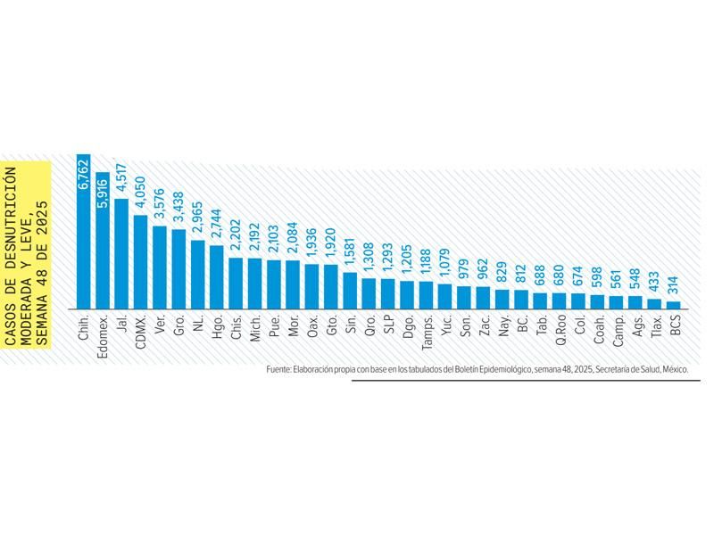 De acuerdo con el Boletín Epidemiológico de la Secretaría de Salud, en hasta la semana epidemiológica número 48 (con corte al 8 de diciembre de 2025), se habían registrado en el país 68,228 casos de desnutrición en el territorio nacional, cifra superior a los 65,082 casos registrados en la misma semana del año 2024; es decir, en un año hubo un incremento de prácticamente 5% en el número de personas atendidas por esta causa de enfermedad.
