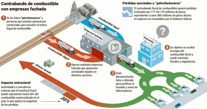 El secretario de Seguridad y Protección Ciudadana, Omar García Harfuch, señaló que la red también hacía uso de prestanombres y redes de distribución para mantener el flujo de combustibles en distintas regiones del país, ocultando el origen ilícito de los recursos.