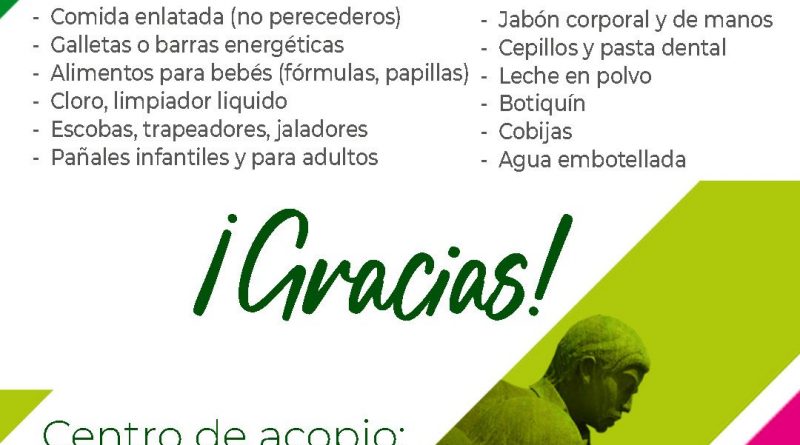 Se reciben alimentos no perecederos, agua embotellada, artículos de higiene personal, ropa en buen estado, cobijas, pañales y productos de limpieza, que serán entregados directamente a las zonas más afectadas.