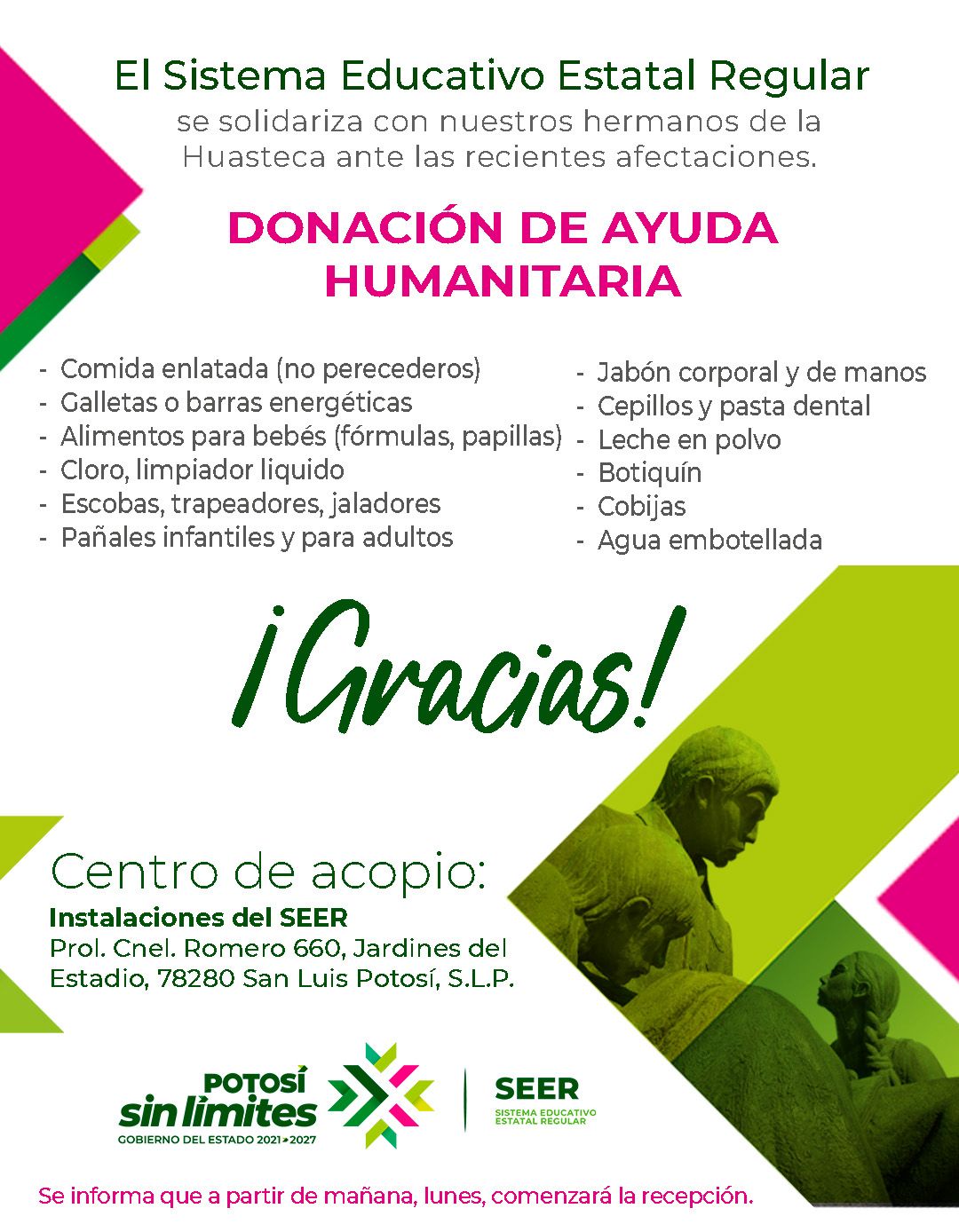 El Gobierno del Estado de San Luis Potosí, mantiene el apoyo a las comunidades afectadas por las intensas lluvias en la Huasteca. Dependencias como el Sistema Estatal para el Desarrollo Integral de la Familia (DIF), la Secretaría de Comunicaciones y Transportes (SCT), el Sistema Educativo Estatal Regular (SEER), entre otras, han habilitado centros de acopio para reunir víveres y artículos esenciales.