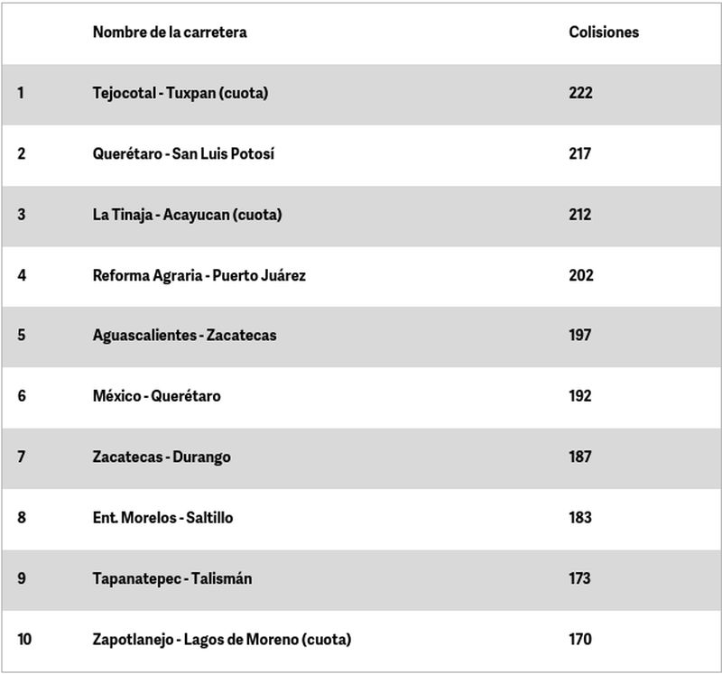 Entre los diez primeros lugares sólo aparece una carretera en Jalisco, Zapotlanejo – Lagos de Moreno (cuota), que ocupa la última posición.