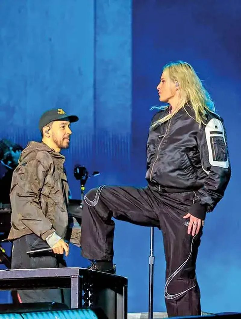 Dos pantallas superiores flotando sobre el escenario dieron la bienvenida a Linkin Park con Somewhere I Belong, con los discos en la tornamesa chillando con el DJ y Emily Armstrong junto a Mike Shinoda entonando el tema de bienvenida, que seguía la tónica de los grupos previos: el sentido de pertenencia después del dolor.
