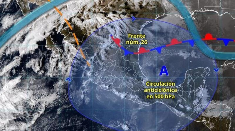 Finalmente, una circulación anticiclónica en niveles medios de la atmósfera favorecerá predominio de cielo despejado y baja probabilidad de lluvia sobre el resto del territorio nacional; manteniéndose ambiente frío a muy frío, con heladas al amanecer y bancos de niebla matutinos sobre entidades de la Mesa del Norte y la Mesa Central.