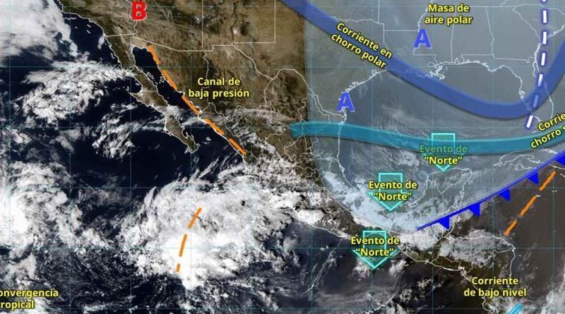Por otra parte, canales de baja presión sobre el norte y occidente del país, en combinación con la entrada de humedad del océano Pacífico, ocasionará lluvias y chubascos con descargas eléctricas en estados del norte, occidente, centro y sur del territorio mexicano, pronosticándose lluvias puntuales fuertes, las cuales se podrían acompañar con descargas eléctricas zonas de Jalisco, Colima, Michoacán, Guerrero y Estado de México.