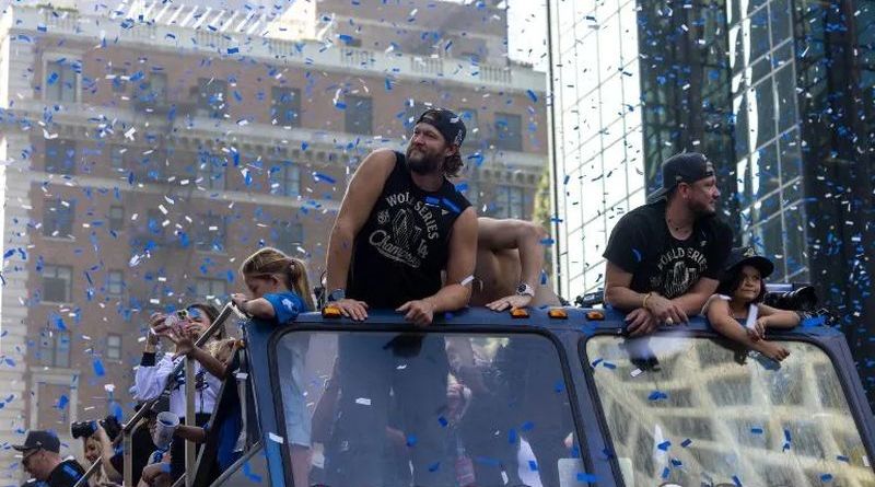 Confeti azul y blanco voló desde un camión que rodaba entre los autobuses, que estaban llenos de familiares de los jugadores, incluido el recién retirado Clayton Kershaw y sus cuatro hijos.