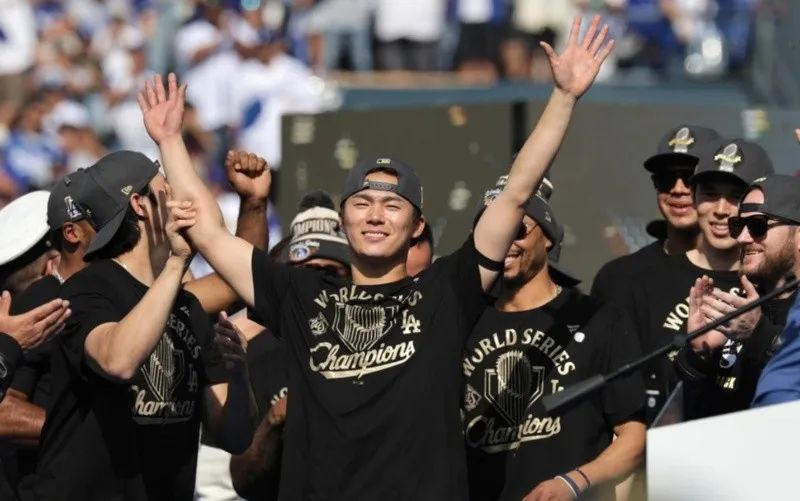 El pitcher Yoshinobu Yamamoto, MVP de la Serie Mundial, llevaba una camiseta negra con el logo “Campeones de la Serie Mundial” en el frente. Con gafas de sol y una gorra de beisbol al revés, Yamamoto saludó a los fanáticos.