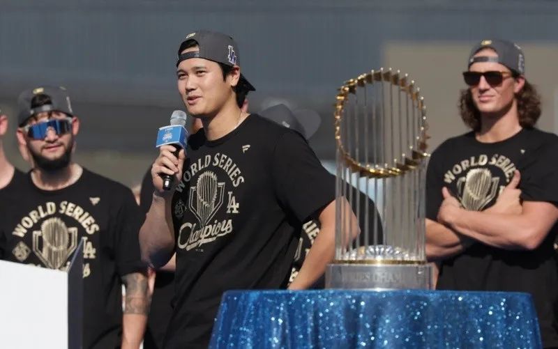 “Hola, hola”, dijo Shohei Ohtani, hablando en inglés frente a un abarrotado estadio de los Dodgers. “Quiero decir que estoy muy orgulloso de este equipo. Quiero decir que ustedes son los mejores fanáticos del mundo. Estoy listo para conseguir otro anillo el próximo año. Vamos”.