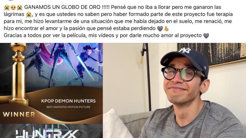El pasado domingo se llevó a cabo la ceremonia de los Golden Globes 2026, donde KPop Demon Hunters se alzó como una de las grandes ganadoras de la noche. Para Cruz Contreras, el triunfo tuvo un significado profundamente personal, algo que compartió con honestidad en su cuenta de Facebook.