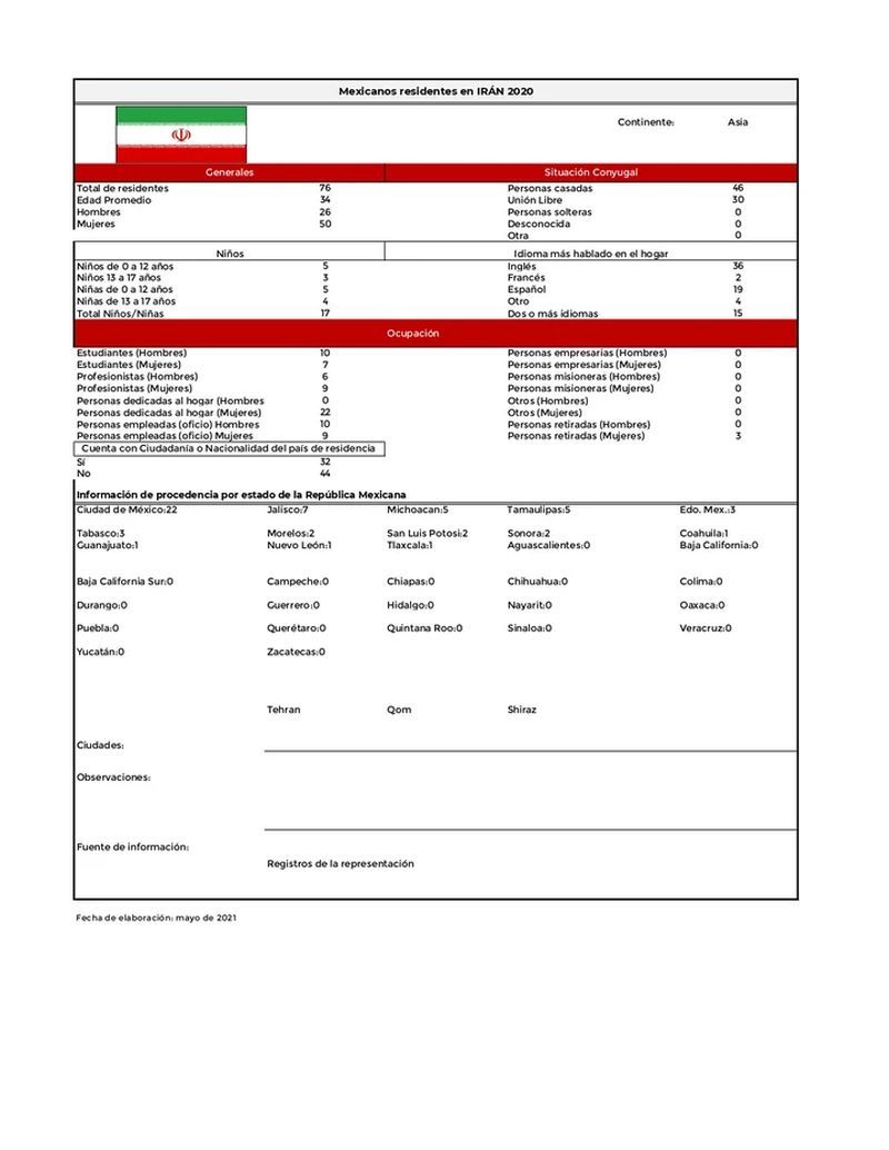 En mayo de 2021, el gobierno federal reportó que en Irán había 76 mexicanos residiendo, la mayoría casados o en unión libre. Además unos 10 estudiantes. Sin detallar el estado se indicó que un coahuilense se encontraba en Irán.