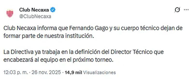 Mediante un breve comunicado, el equipo del Necaxa de la Liga MX anunció hoy, miércoles 26 de noviembre, que Fernando Gago y su equipo técnico dejan de formar parte de la institución.