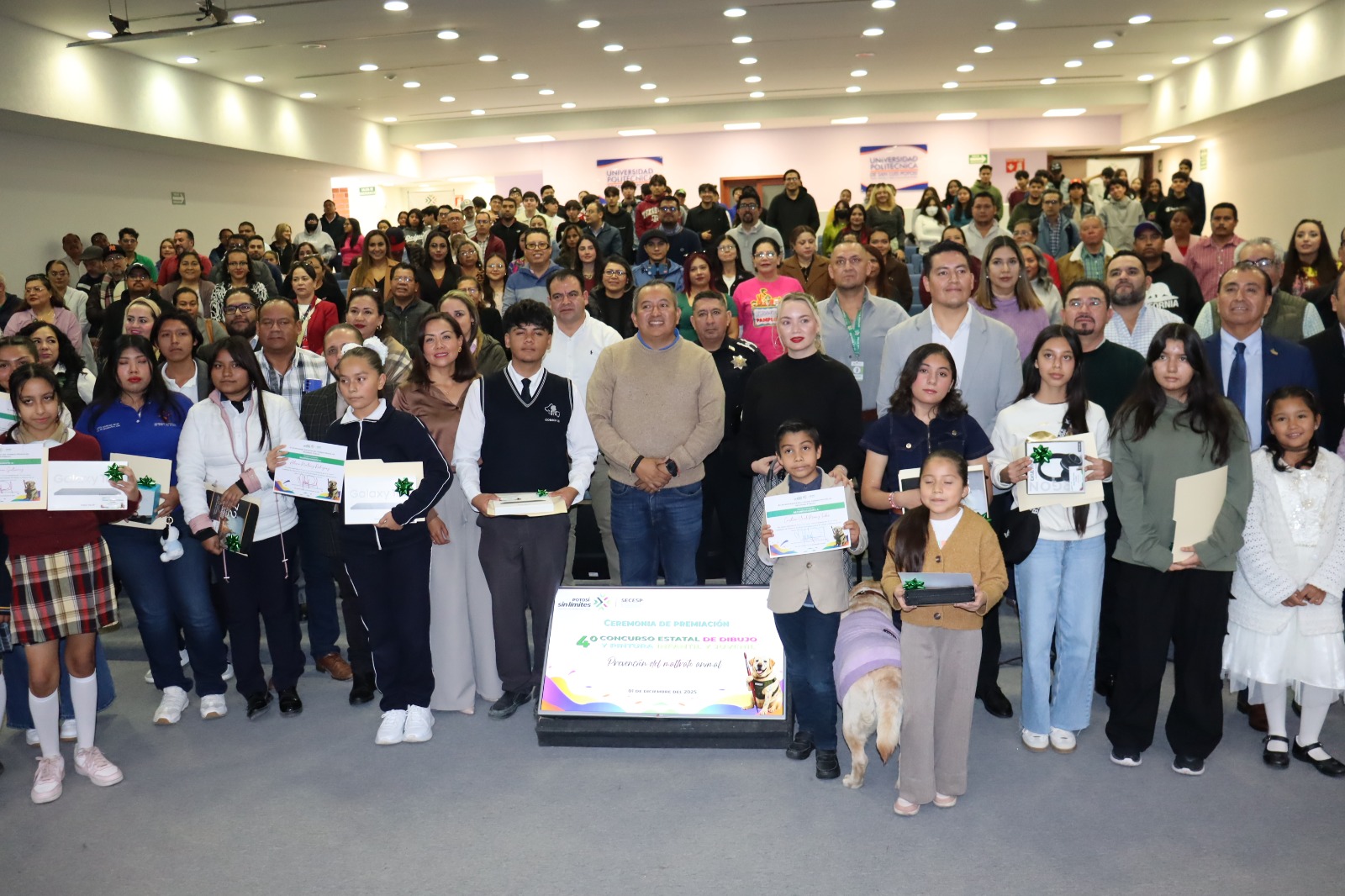 El Secretariado Ejecutivo del Consejo Estatal de Seguridad Pública (SECESP) premió a las y los participantes destacados del Cuarto Concurso de Dibujo y Pintura 2025, en una ceremonia celebrada en la Universidad Politécnica, donde se reconoció su creatividad para representar la prevención del maltrato animal, que fue el tema principal. Esta acción, sumada al Foro Nacional y los diálogos de prevención en las escuelas, son impulsados por el Gobernador Ricardo Gallardo Cardona en búsqueda de consolidar una sociedad que proteja a los animales, con trabajo sin límites.