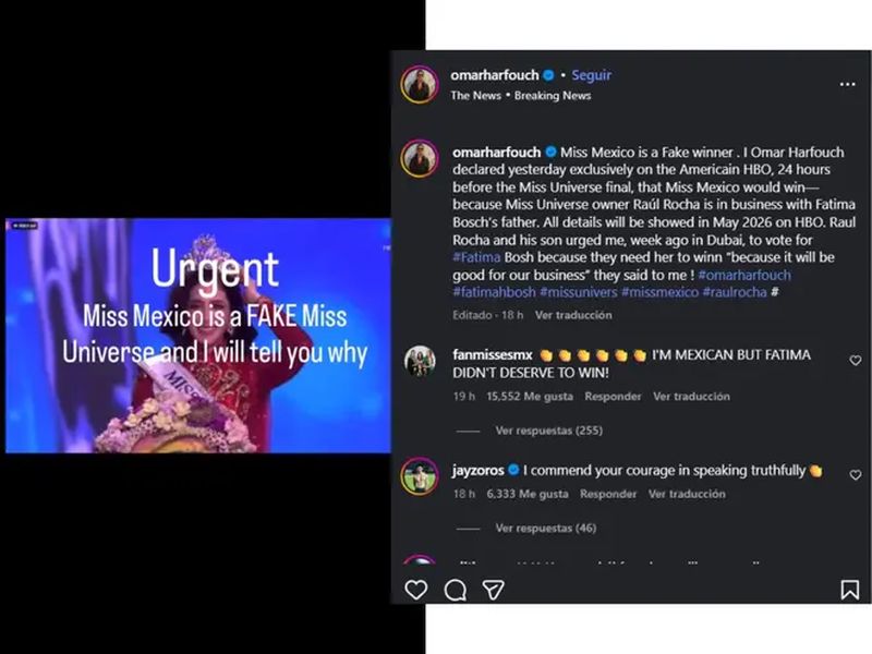 Harfouch no solo cuestionó la transparencia del proceso: lanzó acusaciones directas que detonaron el escándalo. Aseguró que Raúl Rocha, propietario de la Organización Miss Universo, mantiene “negocios” con Bernarno Bosch, padre de Fátima y empresario ligado a Pemex.