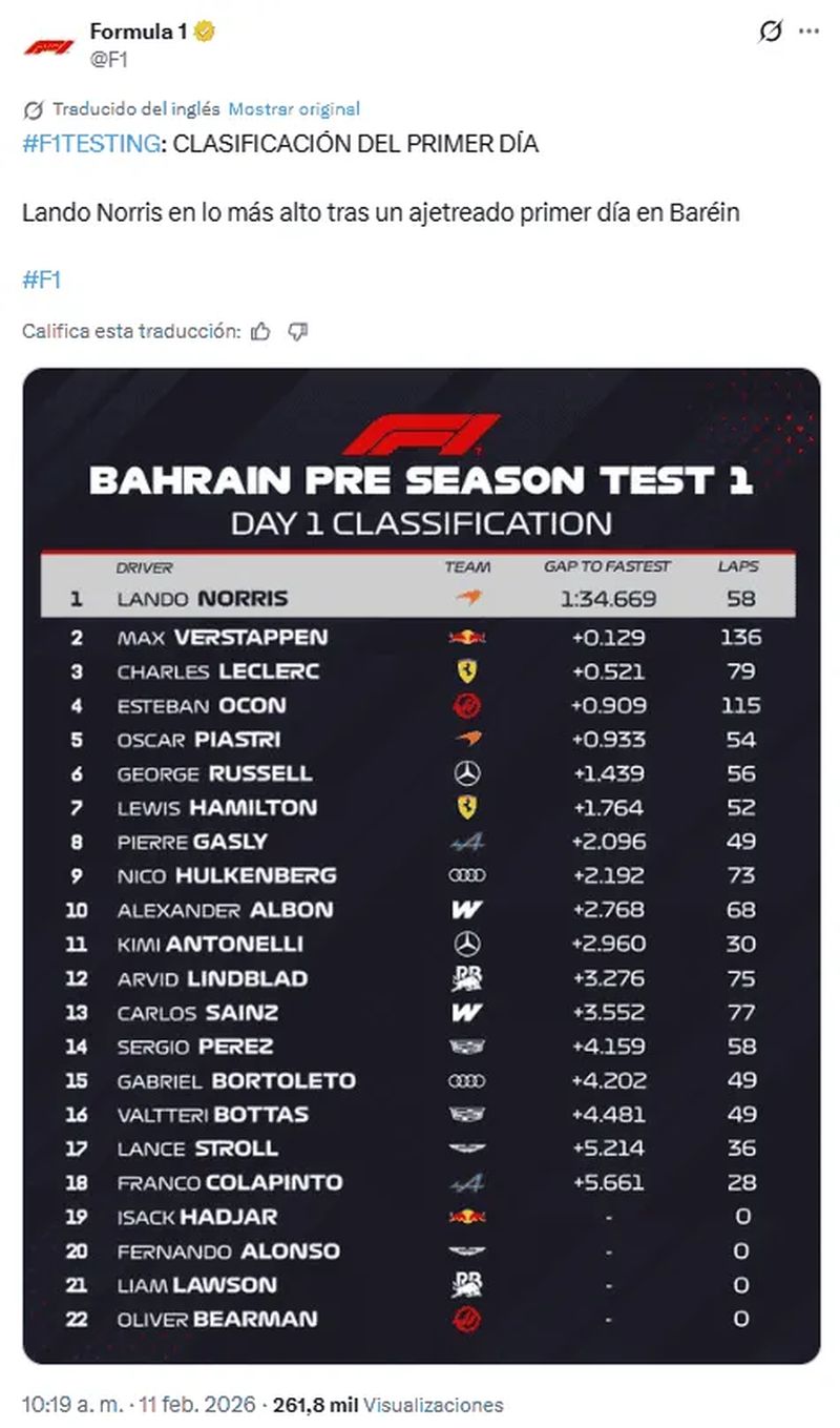 «Por supuesto, estar en Bahrein con sol, las condiciones son muy diferentes a las de Barcelona: hace mucho calor y hay bastante viento, y fue interesante ver cómo se comporta el auto de manera distinta», comentó Norris. «Fue un día positivo, aprendimos mucho y tengo ganas de volver a subirme al auto mañana».