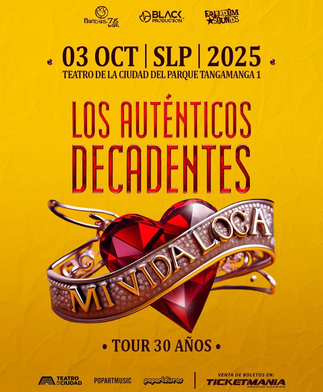Este viernes 3 de octubre, Los Auténticos Decadentes se presentarán en el Teatro del parque Tangamanga I con sus grandes éxitos, mientras que el sábado 4 de octubre, Grupo Intocable se presentará en el Teatro del parque Tangamanga II. Los boletos están disponibles en Ticketmania, Arema y en las taquillas de los recintos.