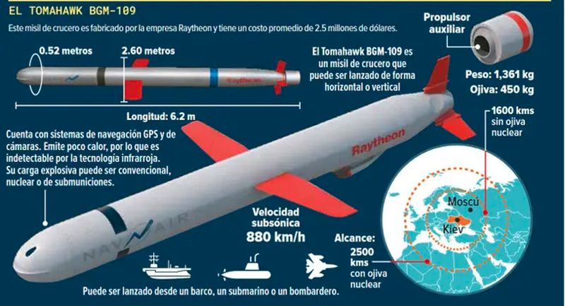 El Tomahawk BGM-109 es un misil de crucero con motor que puede ser dirigido de forma autónoma hacia su objetivo con gran precisión. Cuenta con GPS, vuela a poca altura y emite poco calor, por lo que es difícil de detectar por radares infrarrojos.