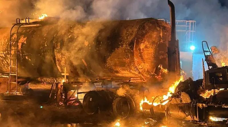 El reporte indicó que uno de los camiones se incendió por completo, aunque se desconoce la cantidad de diésel que transportaba.