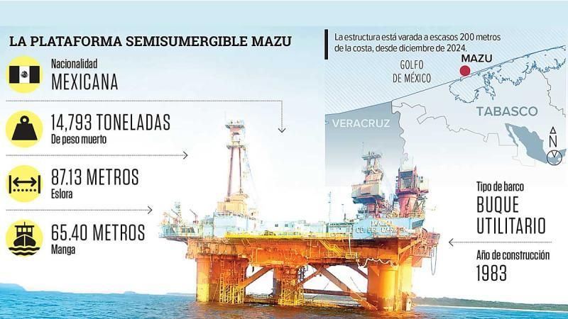A más de un año de haber encallado frente a las playas del ejido San Rafael, en la zona costera del municipio de Cárdenas, Tabasco, la plataforma semisumergible Mazu continúa representando una seria amenaza al medio ambiente y una que también atenta contra la economía de los pescadores del lugar.