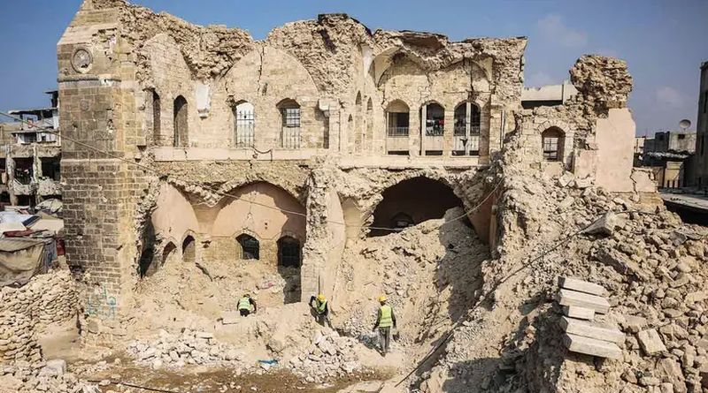 Cerca de una montaña de escombros de varios metros, un artesano restaura cuidadosamente una piedra decorada con una cruz coronada por un creciente islámico, mientras otro limpia una escultura grabada con caligrafía árabe.