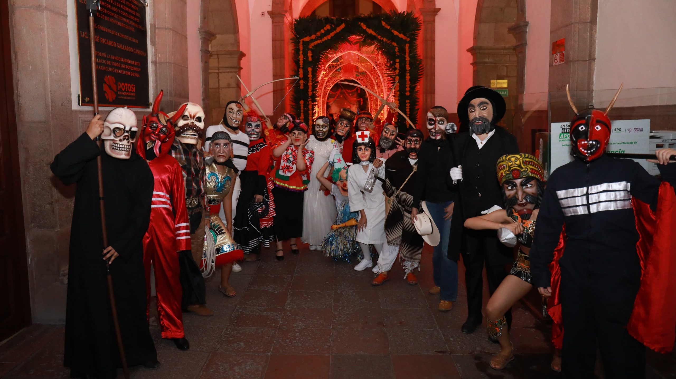 El Palacio de Gobierno se llenó de luz, color y fragancias, con la participación de comparsas tradicionales de la Huasteca y el altar que muestra siete niveles del viaje del alma, representando la travesía espiritual, incluyendo elementos como el agua, la sal, las velas y veladoras, el copal e incienso, las flores de cempasúchil y las calaveras, frutas, pan de muerto, papel picado y fotografías.