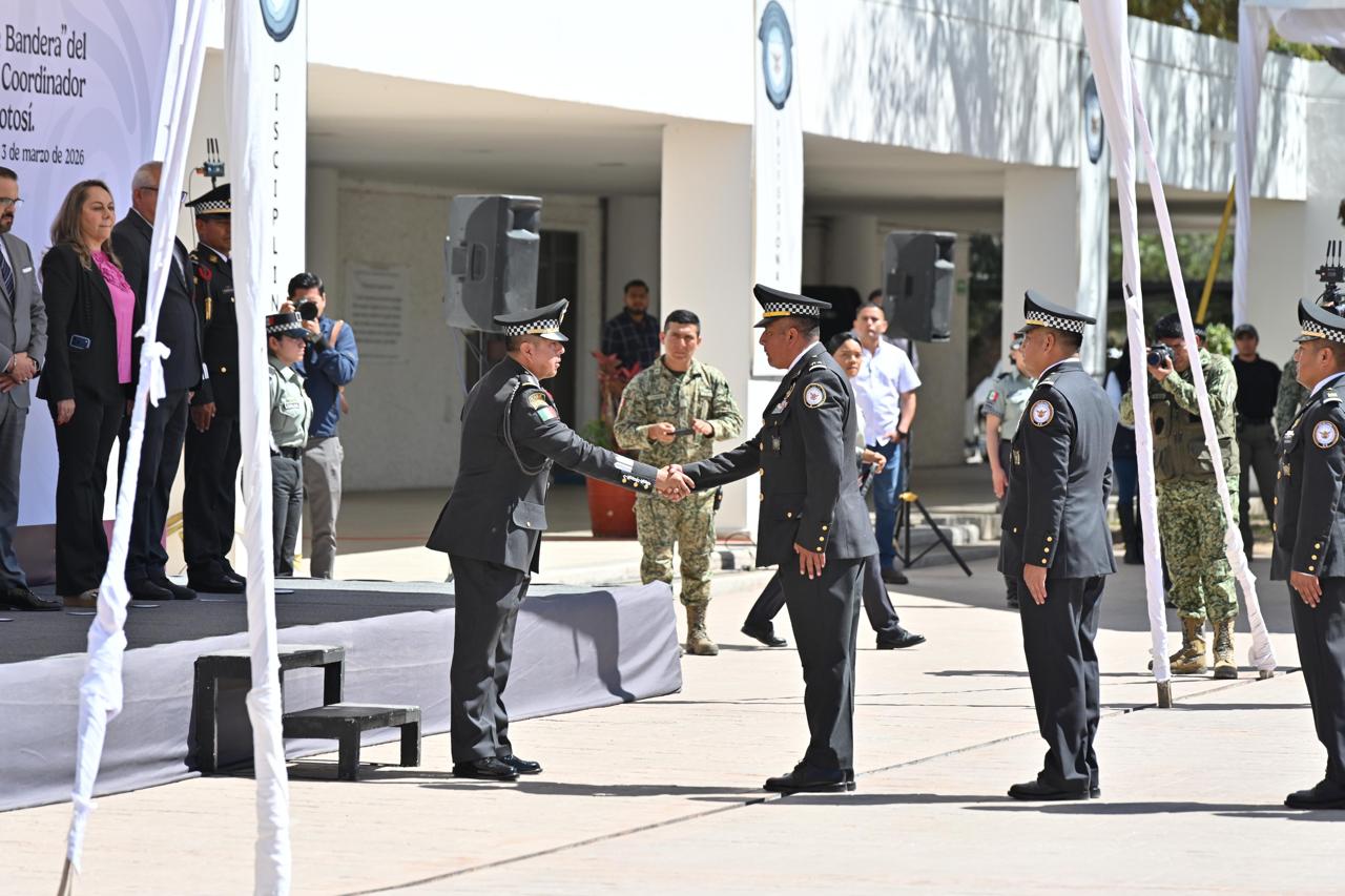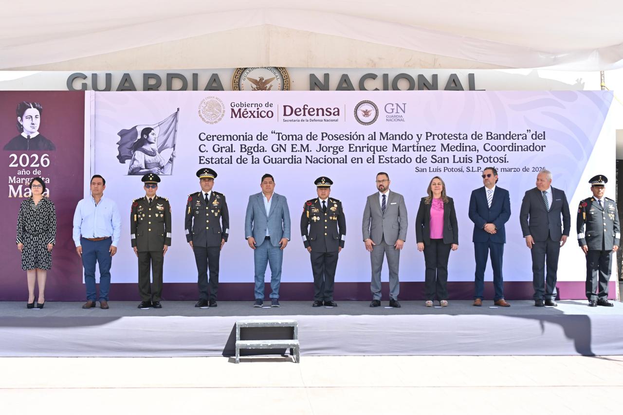 Ricardo Gallardo Cardona, Gobernador de San Luis Potosí, asistió a la toma de protesta de bandera y posesión del nuevo coordinador de la Guardia Nacional en el Estado, Jorge Enrique Martínez Medina, a quien felicitó y reafirmó su colaboración para seguir manteniendo a la entidad potosina entre una de las cuatro más seguras del país.