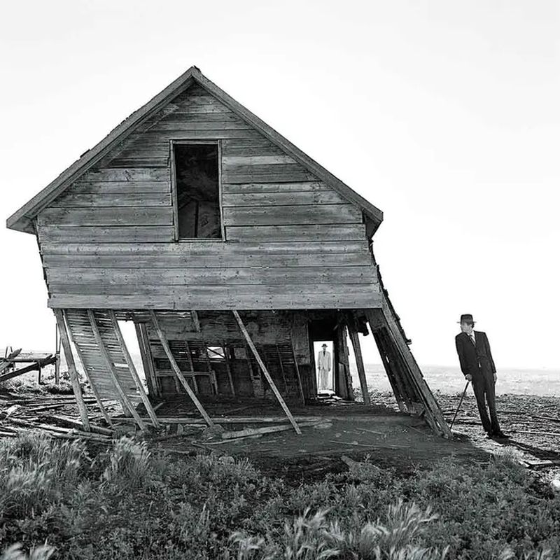 Otra de las imágenes de la muestra es Casa inclinada (2004), en la que se aprecia una casa de madera, a punto de colapsar, con dos personajes enigmáticos, que revelan la influencia que Rodney recibió de Alfred Hitchcock, René Magritte y de la literatura de Ernest Hemingway.