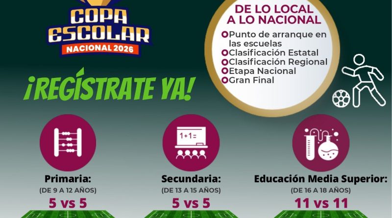 La Secretaría de Educación del Gobierno del Estado convoca a estudiantes de educación básica y media superior a participar en la Copa Escolar de Futbol 2026, fase estatal, cuyo objetivo es fomentar valores como la disciplina, el trabajo en equipo y la sana convivencia, además de seleccionar al equipo que representará a San Luis Potosí en la etapa nacional.