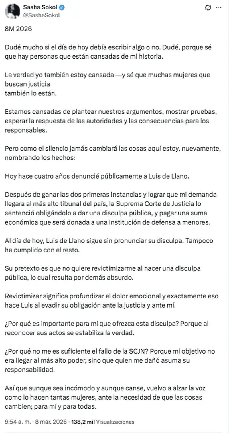 A cuatro años de haber denunciado públicamente el abuso que vivió cuando tenía 14 años, la cantante Sasha Sokol aseguró que el productor Luis de Llano sigue sin cumplir con la sentencia dictada por la Suprema Corte de Justicia de la Nación (SCJN).