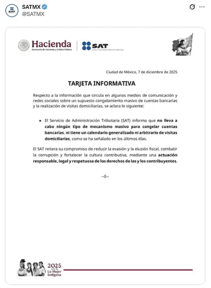 El Servicio de Administración Tributaria (SAT) desmintió que esté realizando un congelamiento masivo de cuentas bancarias, luego de que usuarios en redes sociales reportaran un supuesto bloqueo de este tipo de instrumento financiero.