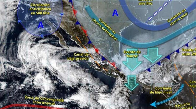El frente frío 29 se desplazará sobre el oriente de la península de Yucatán. Simultáneamente, su masa de aire polar cubrirá el golfo de México, ocasionando viento de componente norte con rachas de 70 a 90 km/h en el istmo y golfo de Tehuantepec (Oaxaca y Chiapas) y rachas de 30 a 50 km/h en costas de Veracruz (sur), Tabasco, Campeche, Yucatán y Quintana Roo; además de ambiente frío a muy frío, con heladas matutinas y bancos de niebla en zonas de la Mesa del Norte y Mesa Central.