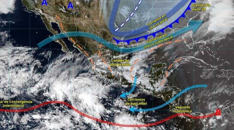 El frente frío número 28 recorrerá rápidamente el sureste mexicano y la península de Yucatán, continuará interactuando con una vaguada en altura sobre el golfo de México, generando de intervalos de chubascos a lluvias puntuales muy fuertes en ambas regiones, con lluvias puntuales intensas en regiones de Chiapas y Tabasco.