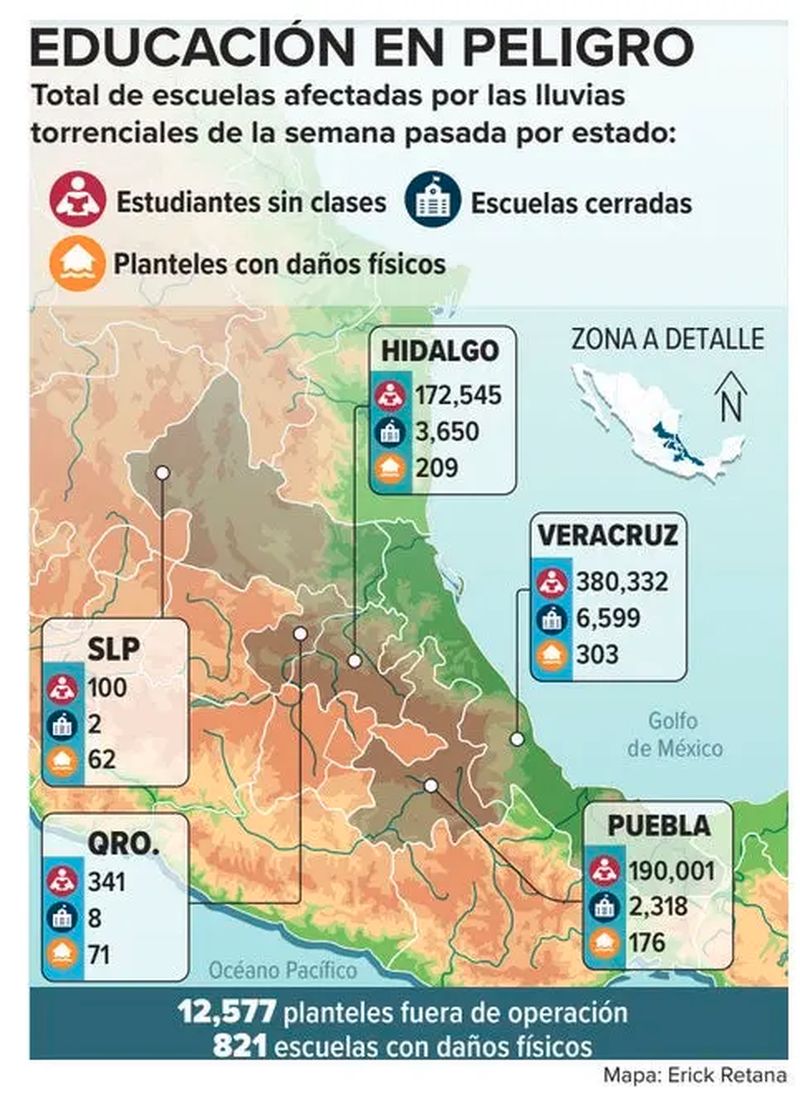 El titular de la Secretaría de Educación Pública (SEP), Mario Delgado, informó que los estados afectados son Veracruz (6 mil 599 escuelas), Hidalgo (3 mil 650), Puebla (2 mil 318), Querétaro (ocho) y San Luis