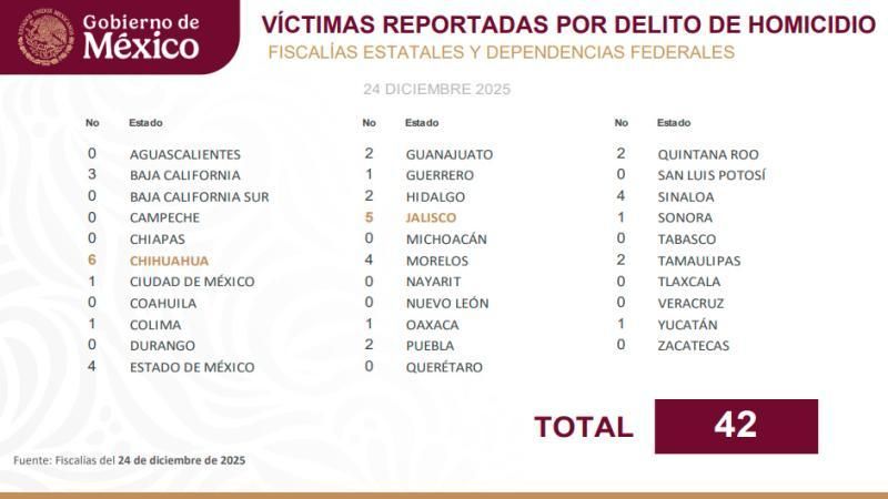 El informe detalla que Chihuahua registró seis víctimas, Jalisco cinco y el Estado de México cuatro, dentro de un total de 42 homicidios dolosos ocurridos en el país durante esa jornada.